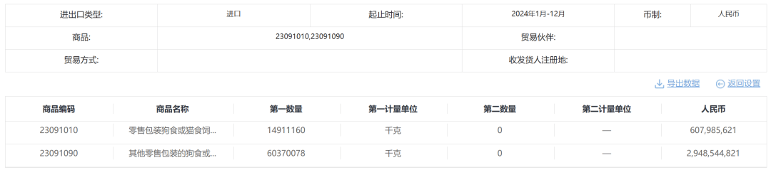 此中,同比2023年的40。12亿元下降了11。37%;2024年宠物食物的进口总量达7。52万吨,同比2023年的8。69万吨下降了约13。46%。