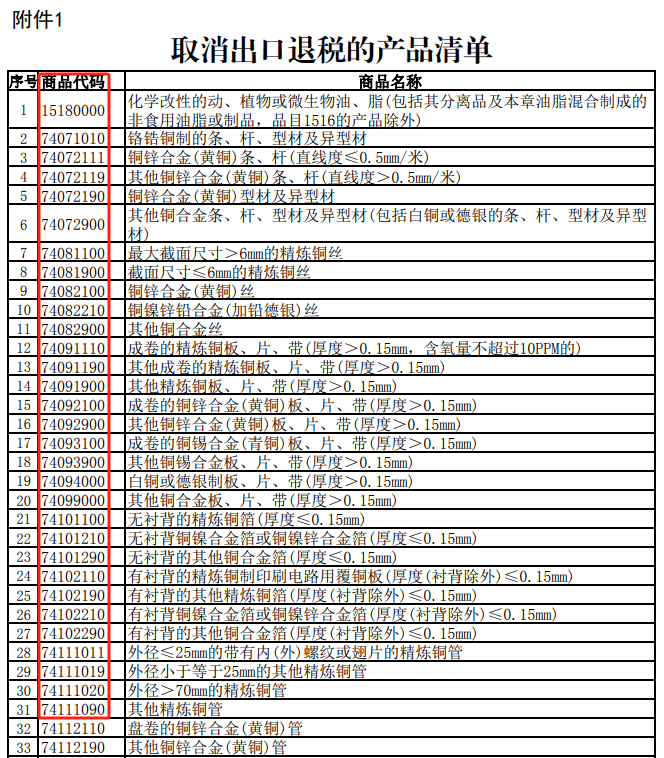 关于打消出口退税的产物清单,总共包含59个产物,好比精辟铜管、铜板,其他铜合金条等,根基都是金属材料一类。