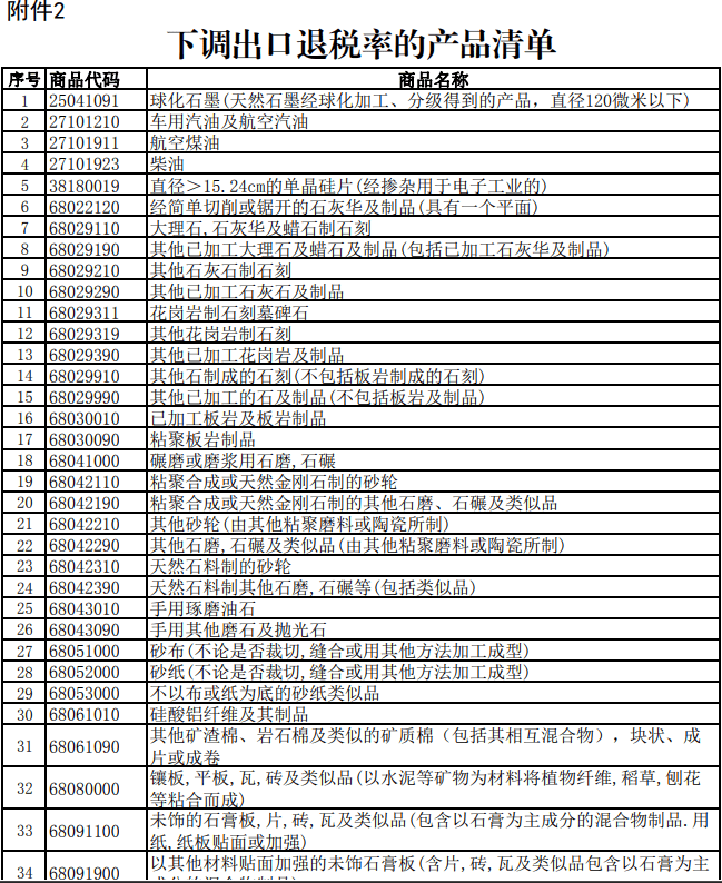 一是:打消不产产物的出口退税,动物或微生物油、脂,铝合金制空心异型材、铜锌合金丝等产物。二是:将部门产物的出口退税率由13%下调至9%,好比成本油、光伏,电池、部门非金属矿物成品。三是:该通知布告自2024年12月1日起实施。而且表白通知布告所列产物合用的出口退税率以出口货色报关单说明的出口日期界定。